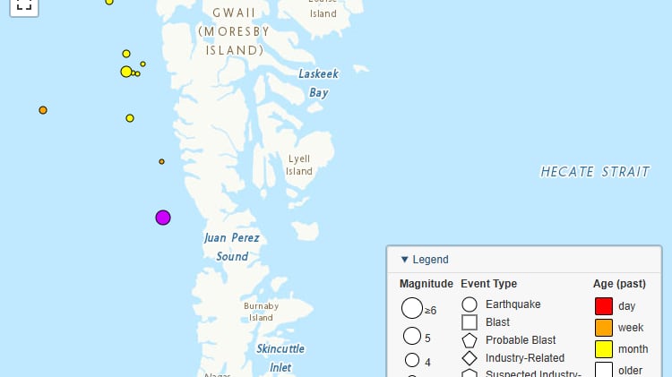They stated that the quake struck at 6:25 AM about 93 kilometres southeast of Daajing Giids, near Haida Gwaii.